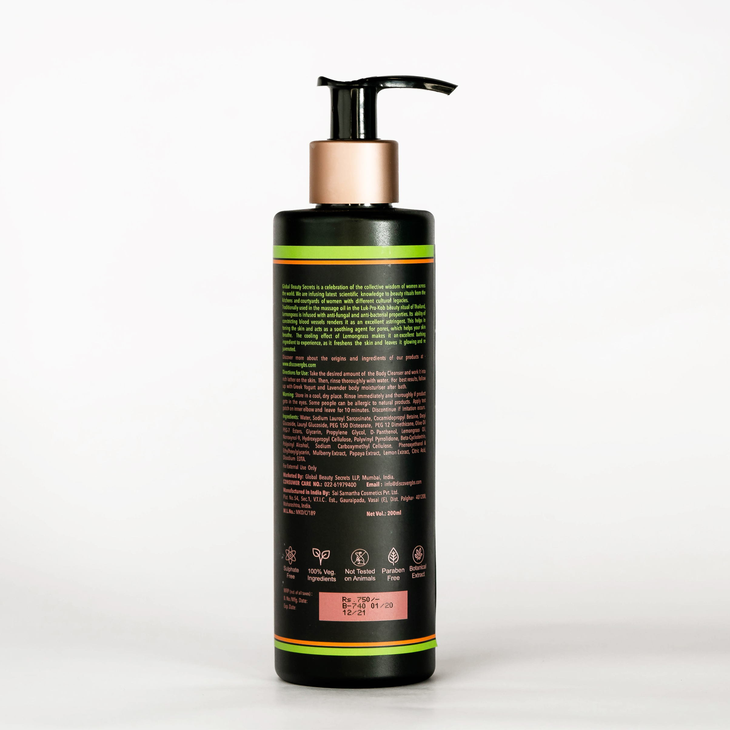 a long-lasting effect on the skin. The Thai Lemongrass Body Cleanser helps detoxify the skin, while simultaneously moisturizing it and reducing signs of ageing. This cleanser consists of 46% natural ingredients along with surfactants derived from natural sources like corns,coconuts,and renewable materials.