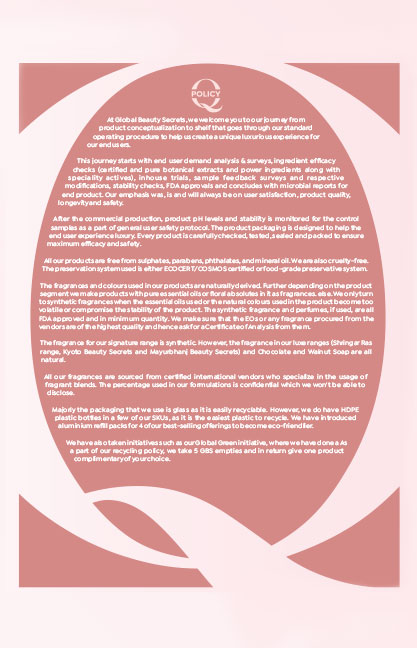 Welcome to the journey of discovering ancient wisdom, designed for the modern era.Global Beauty Secrets is a celebration of the collective wisdom of women. We are infusing the latest scientific knowledge to ancient rituals and beauty secrets of women around the world.Global Beauty Secrets is an endeavour to help discover, revive, create, and share beauty rituals and secrets from around the world. In spirit, it is about celebrating, loving and bonding with the same cultural differences that otherwise have divided us. In honor of my mother, grandmother and other wise women and men across the world, who have helped me in my journey of self care and gave me the inspiration to create Global Beauty Secrets.We are here to help make beauty more democratic, more inclusive and more personal.To contribute in creating a world, a community and a space for everyone to feel included, loved and beautiful.We are driven towards creating a conscious brand that honors you, the environment, its sources of inspiration or knowledge and ourvarious ingredients which are sustainably sourced and mindfully formulated.