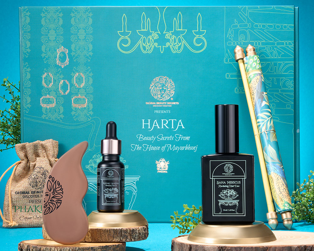 Mayurbhanj Beauty Secrets: The Harta - Beauty Secrets from the House of Mayurbhanj reflects the majestic family legacy of Princess Mrinalika Bhanjdeo, the daughter of the 47th ruler of Odisha’s glorious Bhanja dynasty. It is a tribute to the Royals of Mayurbhanj and their elegant royal residence, The Belgadia Palace.