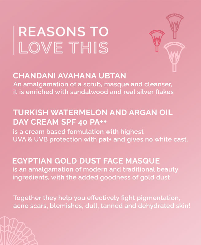 The product is infused with the goodness of Chandan that acts as an emollient and has powerful hydrating effects on the skin, penetrating deep to deliver an intense dose of moisture and silver leaf which has antibacterial and antioxidant properties. We recommend using this ubtan twice a day and see visible effects - skin tightening and toned complexion within 15 days. It will tone, rejuvenate, detoxify and control the oil on your skin while making you feel fresh and relaxed.The day cream is the ultimate antiaging warrior as it acts at four levels - connective tissue repair, targeting pigmentation, moisturizing and UV protection. This product is 83% natural contains 4% niacinamide and is enriched with watermelon extracts, Peptides, Arbutin and Liquorice extracts.Our Egyptian Gold Dust Face Masque is infused with 24K Gold which stimulates the skin cells to produce more collagen and increases blood flow, Niacinamide decreases large pores and softens fine lines and wrinkles and Arbutin helps tackle hyperpigmentation. Moreover, This Egyptian Gold Dust Face Masque is 94.41% natural. It has leaves super hydrating and cooling effect to your skin post application.It is also a perfect post makeup removal skin calming ritual that helps calm your skin and relax it after a tiring day.This face masque is Made in India, Cruelty Free/ Not Tested on Animals, Recyclable and is packed in an environment friendly aluminum Packaging.
